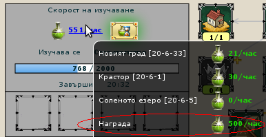 - Бонуса от Древната магия, който също се вижда в Лабораторията на алхимика. Различен е за всяка сграда. Ако бонусът действа, иконата за поръчване на услугата до скоростта на добив свети в зелено.